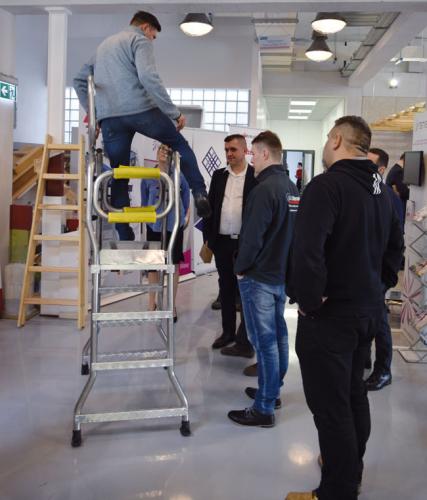 Nowa platforma dla tynkarzy i malarzy wykonana została w całości z aluminium. Wyposażona jest w antypoślizgowe stopnie i antypoślizgowe stopy, które zapewniają większe bezpieczeństwo niż w przypadku drabiny drewnianej. Poszerzone i wyprofilowane pod kątem górne stopnie, zrobione zostały z kraty ortoftalowej (GRP), co ma na celu zapobieganie zbieraniu się zanieczyszczeń, a tym samym zwiększenie bezpieczeństwa pracownika. Sama krata jest lżejsza od stalowej i odporna na korozję. Stopień ten ma ranty, które ułatwiają użytkowanie.