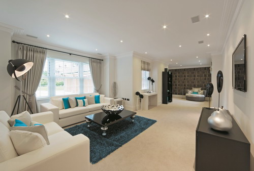 Salon zatopiony w kremowej aranżacji z nutą głębokiego błękitu i lazuru w elementach wystroju, prezentuje się niezwykle efektownie. Takie zestawienie kolorystyczne dodaje wnętrzu miękkości i lekkości. Dodatkowa barwa oraz wyraźny akcent wenge przełamują monochromatyczność przestrzeni.