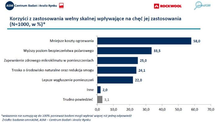 Na kolejnych miejscach zestawienia znalazły się korzyści związane z bezpieczeństwem oraz zdrowiem. Dla 33% badanych kluczowy jest wysoki poziom bezpieczeństwa pożarowego, który zapewniają produkty z wełny skalnej. Na miejscu 3 i 4 badani wskazali kwestie związane z prawidłowym, zdrowym mikroklimatem (25%), a także troską o środowisko i redukcję smogu (24%).