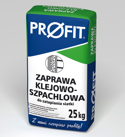 Po wykonaniu tych czynności można, zgodnie z instrukcją znajdującą się na opakowaniu uniwersalnej zaprawy klejowo-szpachlowej PROFIT, przygotować ją do nałożenia na powierzchnię płyt w celu wykonania warstwy zbrojącej. Zaprawę nanosimy ciągłą warstwą pasami o szerokości siatki zbrojeniowej, następnie ją przeczesujemy kielnią zębatą 10×10 mm. W tak przygotowaną warstwę uniwersalnej zaprawy klejowo-szpachlowej PROFIT należy wcisnąć i natychmiast zaszpachlować siatkę zbrojącą do dociepleń. Jeśli sytuacja tego wymaga, do szpachlowania należy użyć dodatkową porcję zaprawy. Siatka zbrojąca powinna być równomiernie naciągnięta, pozbawiona pofałdowań i całkowicie zatopiona w kleju, którego warstwa powinna mieć grubość 3–5 cm. Sąsiadujące ze sobą pasy siatki układamy na 10 cm zakładkę.