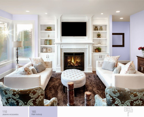 Symetryczne wnętrza są często postrzegane jako spokojniejsze niż ich odpowiedniki artystycznie asymetryczne. Podczas projektowania wnętrz, rozważ nastrój, który próbujesz osiągnąć w swojej przestrzeni. Jeśli chcesz w domu czuć się jak w oazie, z dala od świata zewnętrznego, równowaga drzemiąca w symetrii będzie kluczem, jak w przypadku naszej aranżacji. Nasz projekt dopełniliśmy żywym kolorem ścian. Użyliśmy emulsyjnej farby lateksowej Śnieżka Barwy Natury w dwóch odcieniach: 110 Jesienne Wrzosowisko w salonie oraz 165 Płatki Hortensji w holu.