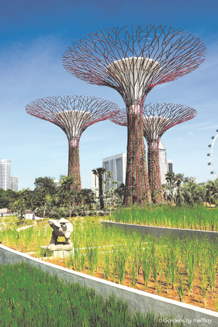 Teren parku wyposażonego w Podniebny Las i Katedry Kwiatów oraz 18 gigantycznych stalowych drzew jest atrakcją turystyczną Singapuru. Stalowe super drzewa o wysokości od 25 do 50 m stanowią podstawę pod różne rośliny.