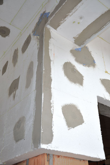 Izolację termiczną – styropian – powyżej poziomu zakończenia izolacji przeciwwodnej klejono do ściany i mocowano mechanicznie na kołki. Kotwy umiejscawiane były w ścianach warstwowych (dotyczy cokołów). Zastosowano kotwy drutowe ocynkowane w ilości 5 szt./m2. Przy narożach kotwy należało zagęścić do 7 szt./m2. Ostatnia górna warstwa kotew umieszczana była w ostatniej górnej warstwie cegieł cokołowych. Izolację termiczną – styropian na izolacji przeciwwodnej klejono punktowo do izolacji przeciwwodnej za pomocą środka Superflex 10 (nie mocowano mechanicznie). Ściany murowane zewnętrzne pod ziemią i w strefie przyziemia do wysokości 50 cm nad terenem (cokoły) były hydrofobizowane bezbarwnym środkiem Deiteriol S.