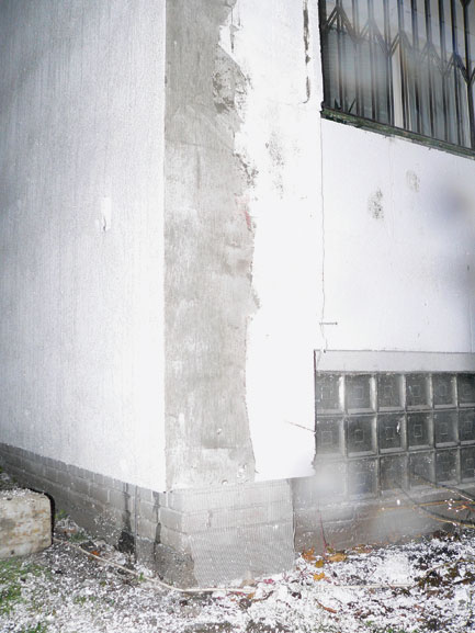 - Tkanina zbrojąca z włókna szklanego zabezpieczająca przed uszkodzeniami mechanicznymi – zatopiona w masie klejącej. Przyjęto tynk mineralny malowany farbą silikonową cienkowarstwowy o ziarnistości 1,5 mm. Faktura „kasza”.